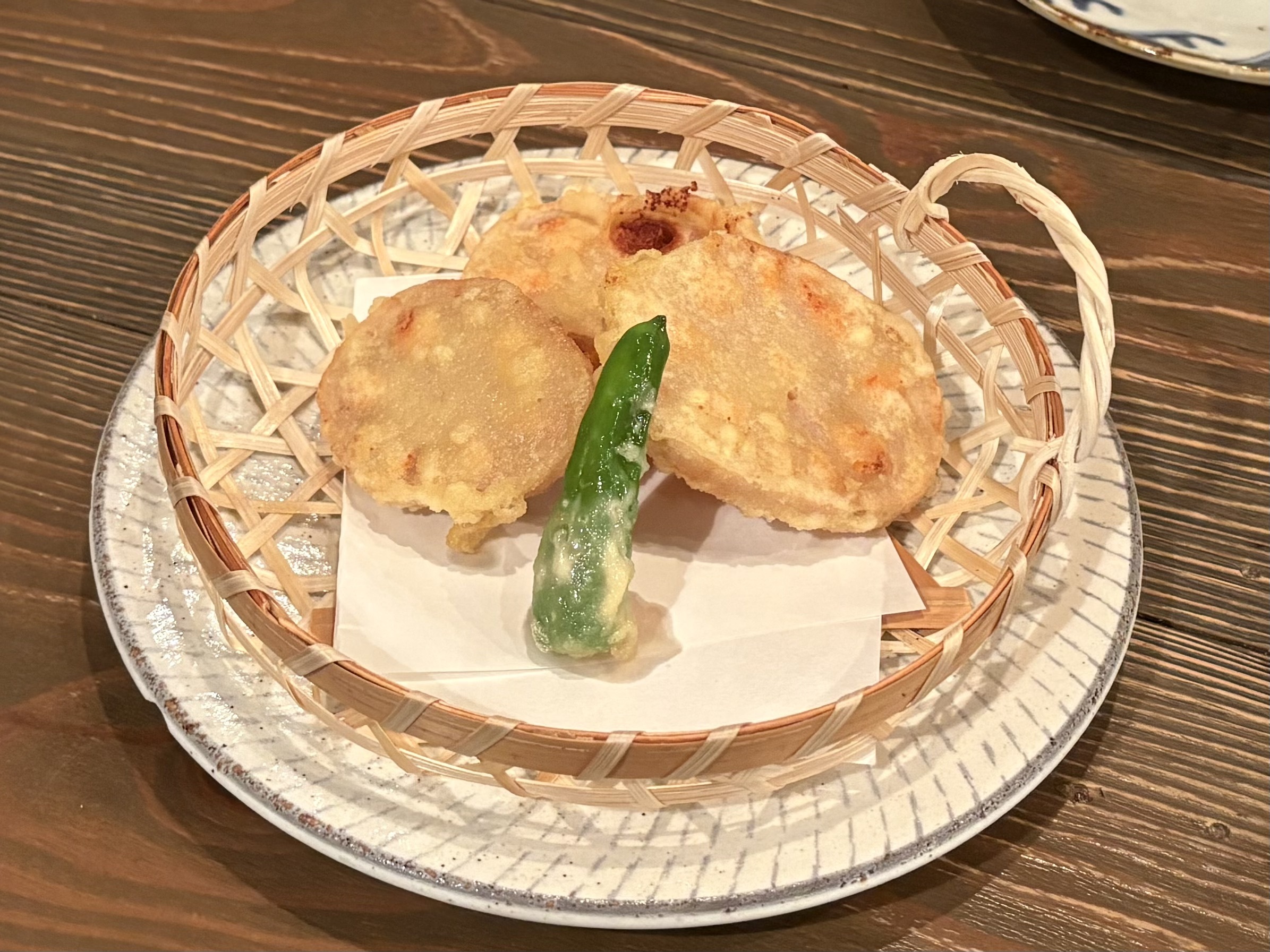 干し柿のクリームチーズ和えと明太蓮根の天ぷらで箸休め
