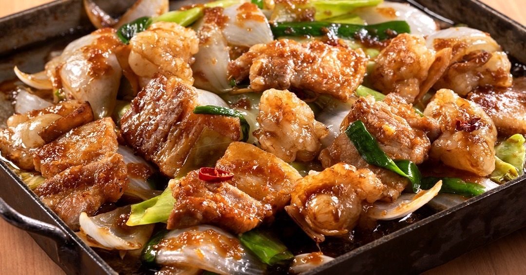 🧅『 大とろホルモン鉄板焼き新玉と豚バラの生姜焼き』
