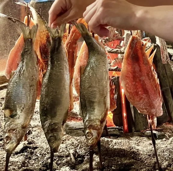 串に刺した魚を炭火の横に立てかけて焼くことで、余分な水分や脂が落ち、旨味が凝縮されます。