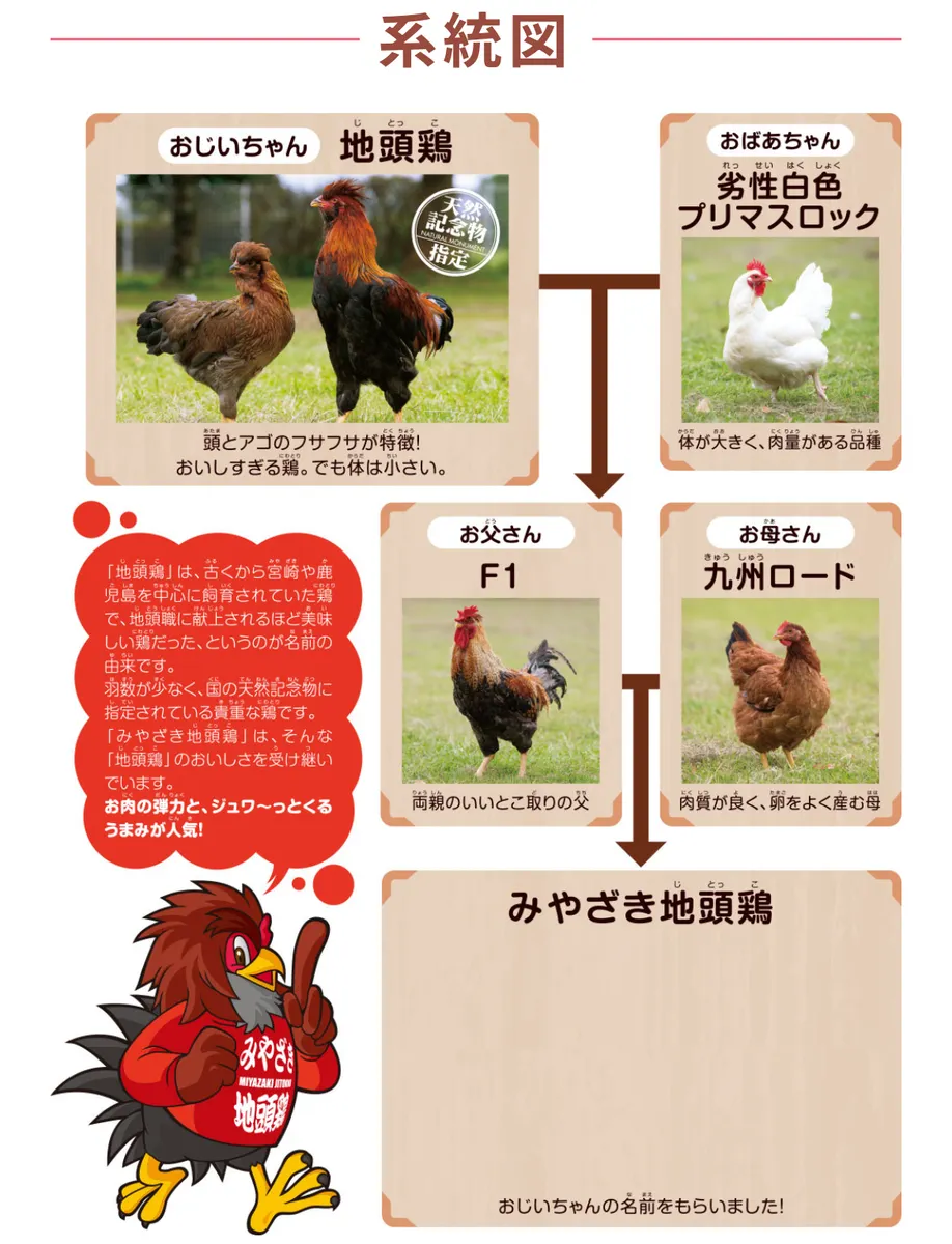 →昭和60年に、宮崎県の地域性を持つ地頭鶏を原種鶏とした「みやざき地鶏」の開発が始められました。