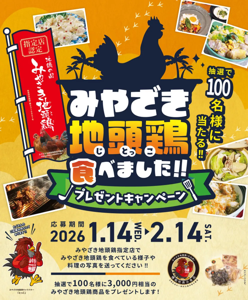 指定店で、みやざき地頭鶏を食べてる様子や料理の写真を送るとプレゼントが当たるかも!?✨