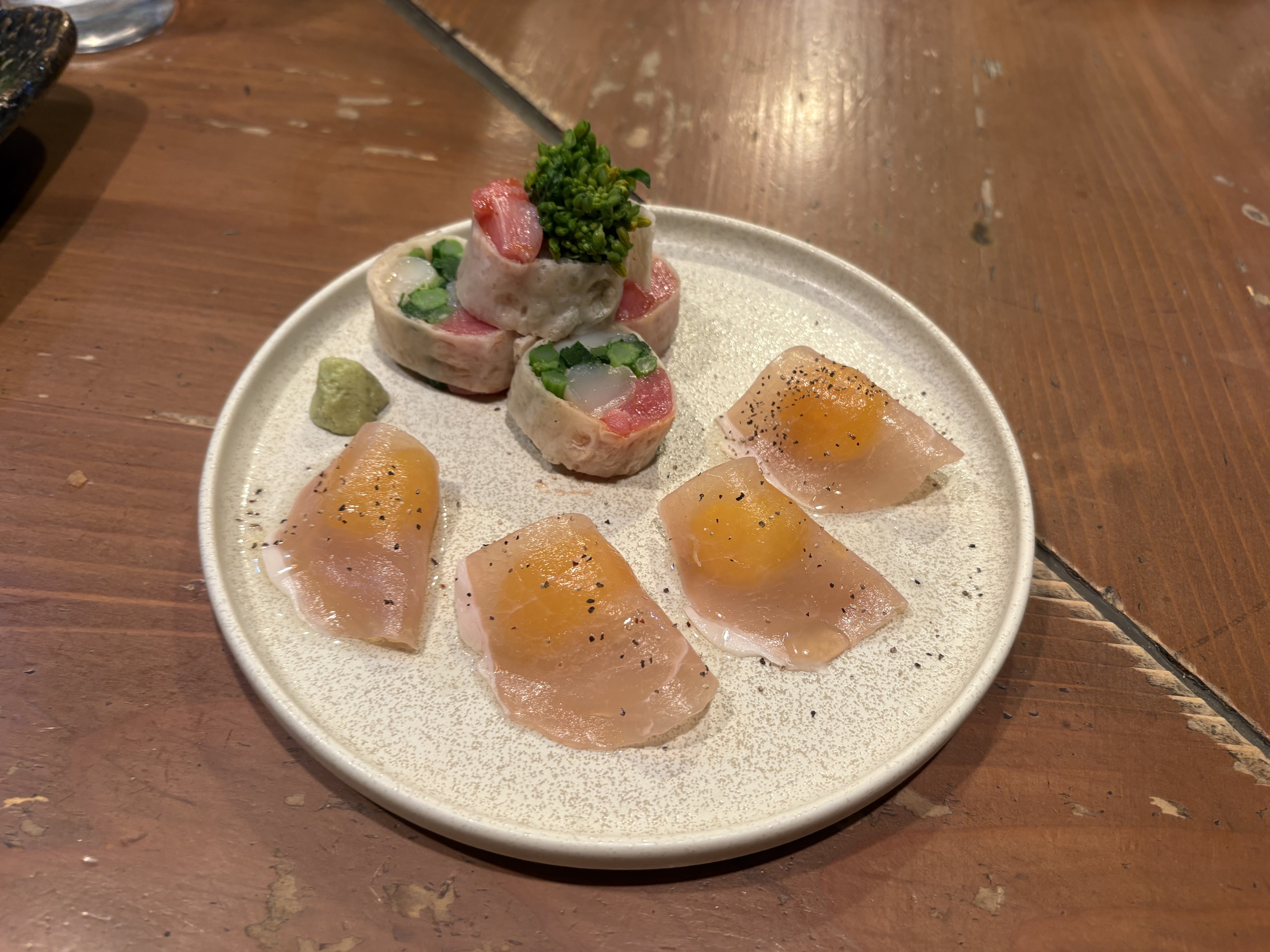 マグロと小柱のロール巻きにパパイヤのコンポート生ハム巻きもおしゃれ