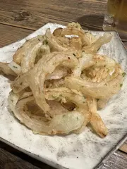 新玉葱🧅 新玉葱のり塩揚げは、絶妙な塩加減と、新玉葱の甘さでめちゃめちゃ美味しかった〜!! もちろん安定のポテトも注文🥔