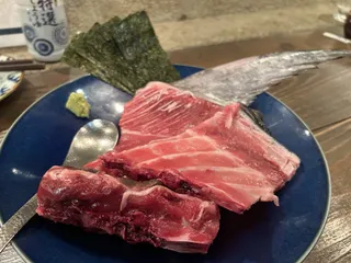 ガッツリと 今日もがっつりマグロの中落ちとひるが寒ブリのカマ焼き 焼きも刺しも大満足‼️ お通しは甘エビ醤油漬けと、水だこ梅水晶和え
