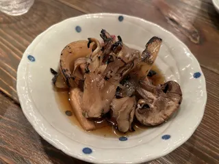 あて巻き ちょっと最近どこにも行けてなくてこれもアップ遅くなっちゃったけど…。シャケ味噌いくら巻き。あて巻きは店舗によっていろいろあるので、それを探してみるのも楽しみ…さらに広田つぶときのこのガリバタ焼き。定番においしいガリバタアヒージョ。 お通しはトロニシンと寒ブリの甘酢漬け 脂身あるお