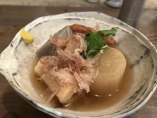 豪華なあら煮大根 安かったので大根メインかと思いきや、想定よりあらが多くてたっぷり日本酒飲めました。ちなみに刺身も食べたかったのでふくいサーモンの単刺しも。めちゃめちゃみずみずしくて癖になりそうお通しは焼ききのこポン酢と炙りふくいサーモン! 炙ったふくいサーモンは皮目に脂たっぷりでこちらもお酒がススム…