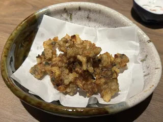 あさりのスパイシー唐揚げ‼️ ちびちとお酒が止まらない…ちなみにつくばにはグランドに茨城のお酒がいっぱい。グランド以外にも……… さらに生ミンククジラのお刺身、ニンニク生姜とごま油塩で、これまたお酒がススム… 炭火もあるのでサクラマスのハラス炭火焼も お通しはマンボウホルモン