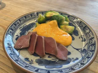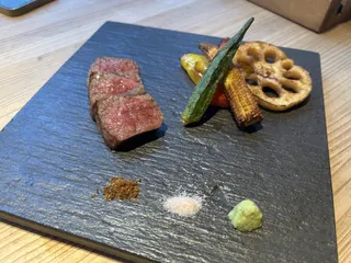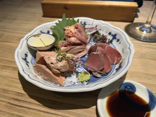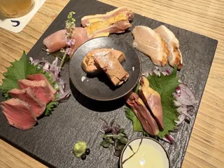 鶏ではなく牛🐮 宮崎牛の炭火焼き…肉々しく肉汁がたっぷり…で、あっという間になくなる…あとは休日のショートコースに地鶏刺し変更で…ドリンクも半額だしなかなか満足!とうもろこしすり流しに前菜4種(ポテサラ、イチジククリームチーズ、鶏ハム、鶏水晶) 地鶏刺し3種盛と追加注文の地鶏白レバー刺し こちら