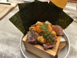 大とろ炭火炙りとろたく‼️ ずっと気になっててやっと食べれたメニュー中には酢飯とマグロすき身が入ってて、海苔で手巻きにして食べるスタイル。マグロとその脂、ウニといくらが口の中で混ざって幸せだなぁと感じる一品ちょうちん串も… 半生のきんかんとハツ、ハツモトが一本になってて、口の中ではじける卵黄とハツの組み合わせが何とも