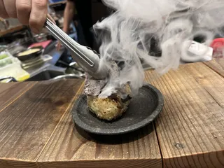 燃えるおにぎり🍙🔥 鶏屋の焼きおにぎりを…かしわ飯にバターを乗っけて、その上に直接炭火を‼️ あぁ、こうやって焼き目をつけるんだ…と思ったらその後煙がモクモクと… 演出も派手だけど、めちゃめちゃうまい!!! そして鮭マヨちぐさピーマン! &nb
