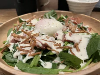 ほうれん草とベーコンのシーザーサラダ 塚田農場品川高輪店に来ています。塚田農場五反田西口店が潰れていたので。 やっぱり飲食業は、路面店・地下1階・地上2階じゃないとダメなんでしょうか⁉️