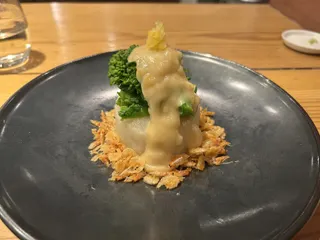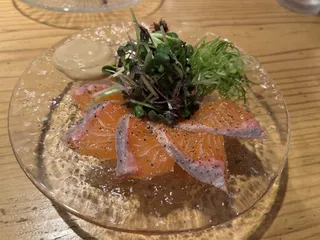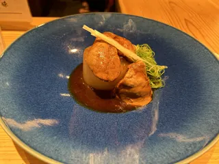 オランダサーモンのカルパッチョ 左上にあるマヨネーズみたいなやつが、なんかキャラメルっぽくて美味!何かと思えばクリームチーズ醤油漬けのペーストだそうで…余ったのをちびちびとやりながらお酒が飲める! …で、次メニュー名何だったかな💦ダシのジュレの上に水ナス、オクラ、鱧の梅和えがのってて、さっぱりとしてちょっと豪華な箸休め。