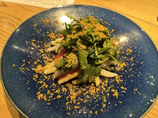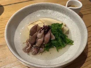 またまたおしゃれに……… 菜の花と大根とサクラえび 柚子味噌掛け…食材も見た目も…そしてさっぱりとした味も春を感じる料理。 そして炙りたこときゅうりの梅ダレがけ。こちらもサッパリでどちらもちょっと酸味がきいた日本酒にぴったり。ちょうど季節酒で仙禽おいてあるし… さらにサーモンと菜の花のタルタル
