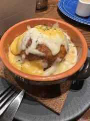 手ごねハンバーグ🧀 皆さんの投稿見てて食べたいと思っていた地鶏入り手ごねハンバーグのチーズグラタンもいただきました!! ハンバーグも、かかってるチーズもどちらも美味しく、お米と一緒に食べたいと思ってしまいました笑