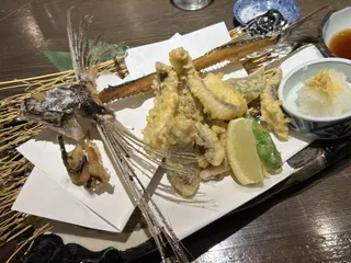 九石大敷を満喫‼️ 岡持ちから九石大敷のトビウオを天ぷらで!ふわふわ…骨ももちろん骨せんべいでおいしくいただきました。 そして九石大敷のコロダイの兜を焼きで! さらにこちらも九石大敷のヒラソウダカツオに、スマカツオ そして沖縄からの活車エビの刺身。頭は素揚げにしても