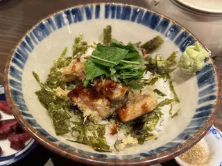 ジャンキーなお茶漬け! 国産ウナギの天ぷら茶漬け。ひつまぶしを茶漬けにしたように見えますが、もっとジャンキー、だけどウナギの味がしっかりしててなかなか美味! そしてイサキ1本半刺し半天ぷらで…刺身はしっかり味があり、天ぷらはふわふわ… お通しはマグロと真鯛の握り🍣