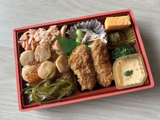 これはスゴい! 10周年コラボ弁当を購入しました。とにかくこの値段でこの盛りだくさんの内容にビックリ!ホタテも鮭もタラフライも美味しかったですが、個人的には牡蠣味噌! 絶対日本酒に合う美味しさです! 星空黒牛のしぐれ煮とともに、ぜひ瓶詰めで販売してください!