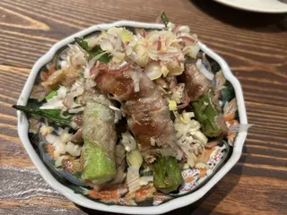 豚巻きオクラの炭火焼 薬味たっぷり😁 そして久しぶりに鶏明太チーズ春巻き 炭火焼も食べつつ久しぶりにキャラメリーゼありプリン GLOWってコーラ割が好き❤️なので、ちょっと作ってもらいました😁