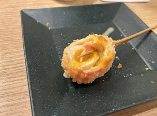 半熟うずら! 串亭の半熟うずらベーコンチーズ。AP系の焼鳥屋にある半熟うずらにベーコンチーズを巻いて串揚げにされた感じソースも良いけど塩もぴったり。ちなみにおまかせコースで頼んだけど、次に何が出てくるかの期待もあってついつい食べ過ぎてしまう…話は変わるけど串揚げってなんかいい写真撮るの難しい…外見だけでもいいけど
