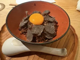 トリュフ鴨そぼろTKG‼️ たくさんの焼き鳥と日本酒の後に… あ、コースに三本追加です🤭