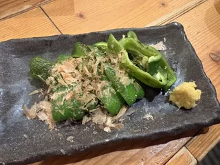 あのちぐさピーマンを原始焼きで…めちゃめちゃ甘いイカゲソの卓上炙りも…お通しはネギトロとろろ昆布がけ………だっけ???
