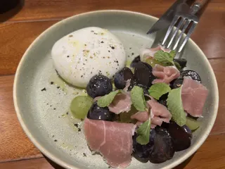 葡萄とブラータチーズのカプレーゼ🍇 まだ食べれてなかった葡萄とブラータチーズのカプレーゼかかってるハチミツに負けないほどの甘い葡萄に生ハムとチーズの塩味が程よくて止まらない… ささみの磯部揚げは程よいのり塩感がささみの半生感と相まって最高の食感と味。 からすみ明太餅も合わないわけがない明太子